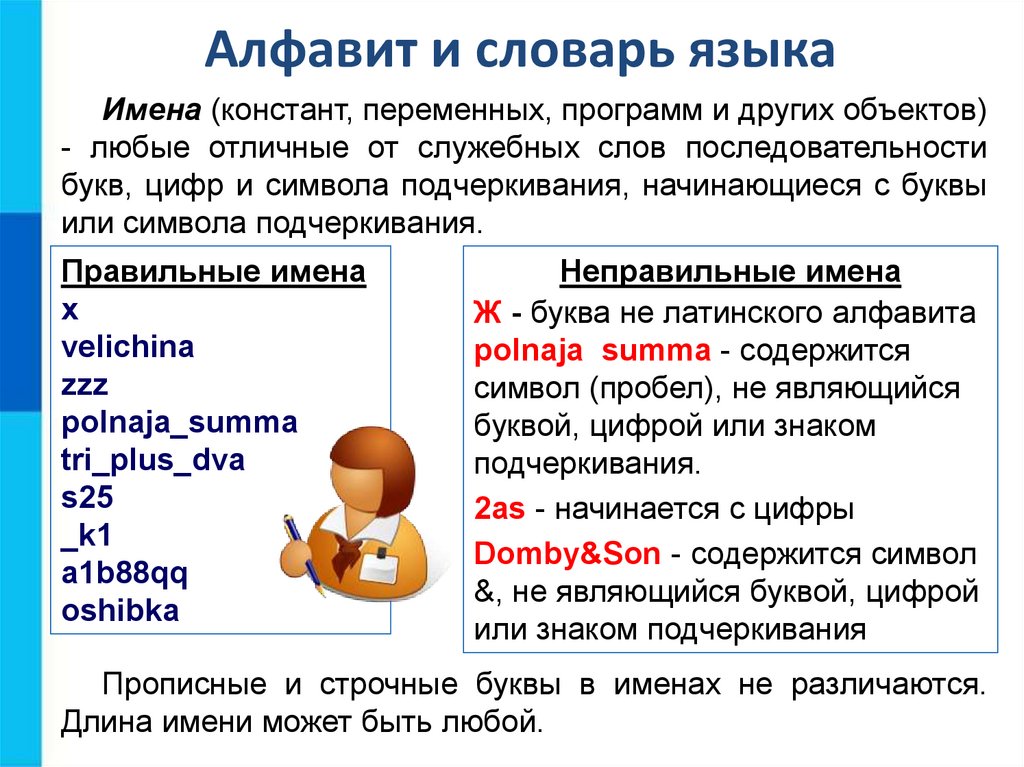 Алфавит и словарь языкаИмена (констант, переменных, программ и других объектов)