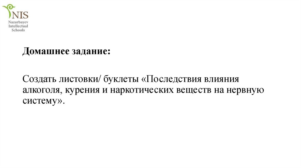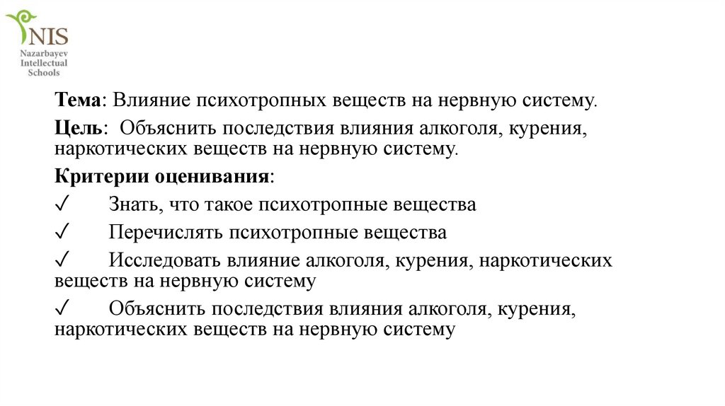 Тема: Влияние психотропных веществ на нервную систему.Цель: Объяснить последствия влияния алкоголя, курения,