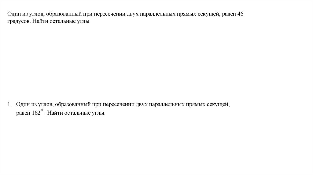 Один из углов, образованный при пересечении двух параллельных прямых секущей, равен 46градусов. Найти остальные углы
