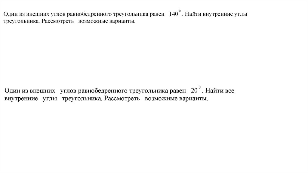 . Один из внешних углов равнобедренного треугольника равен 20 . Найти все