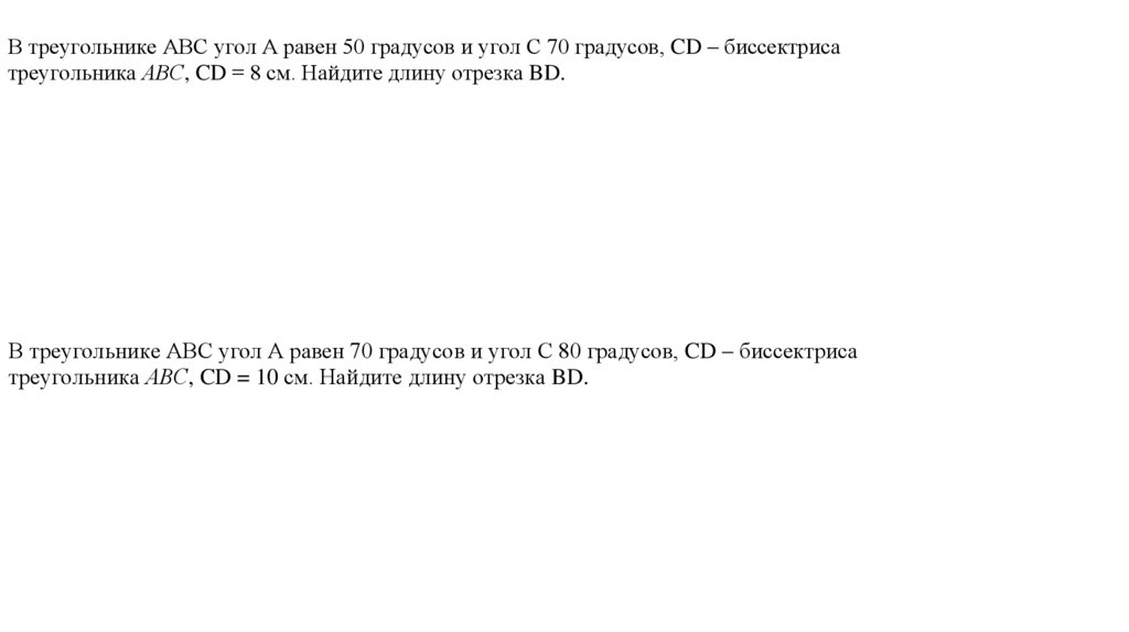 В треугольнике АВС угол А равен 50 градусов и угол С 70 градусов, CD – биссектрисатреугольника АВС, CD = 8 см. Найдите длину отрезка BD.
