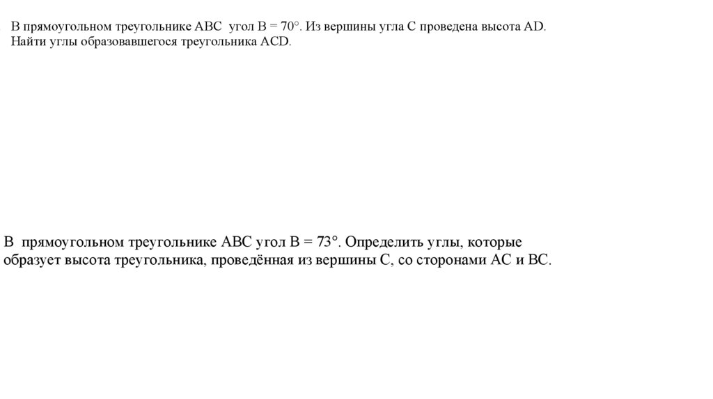 . В прямоугольном треугольнике ABC угол В = 70°. Из вершины угла С проведена высота AD.Найти углы образовавшегося треугольника AСD.