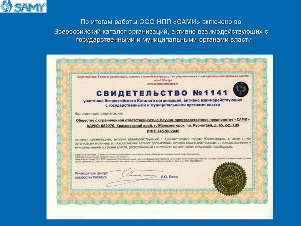 По итогам работы ООО НПП «САМИ» включено воВсероссийский каталог организаций, активно взаимодействующих с