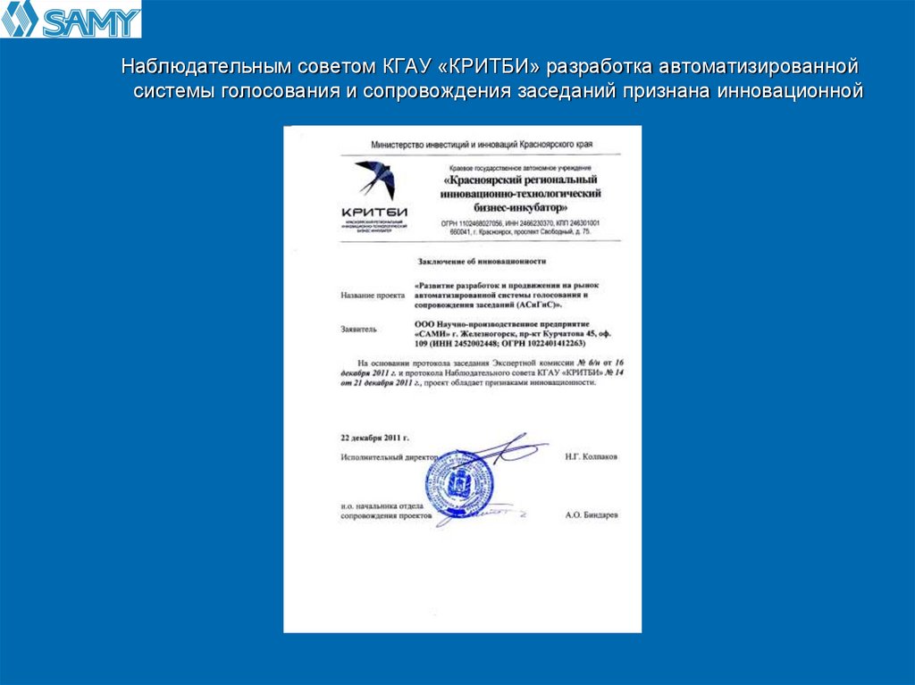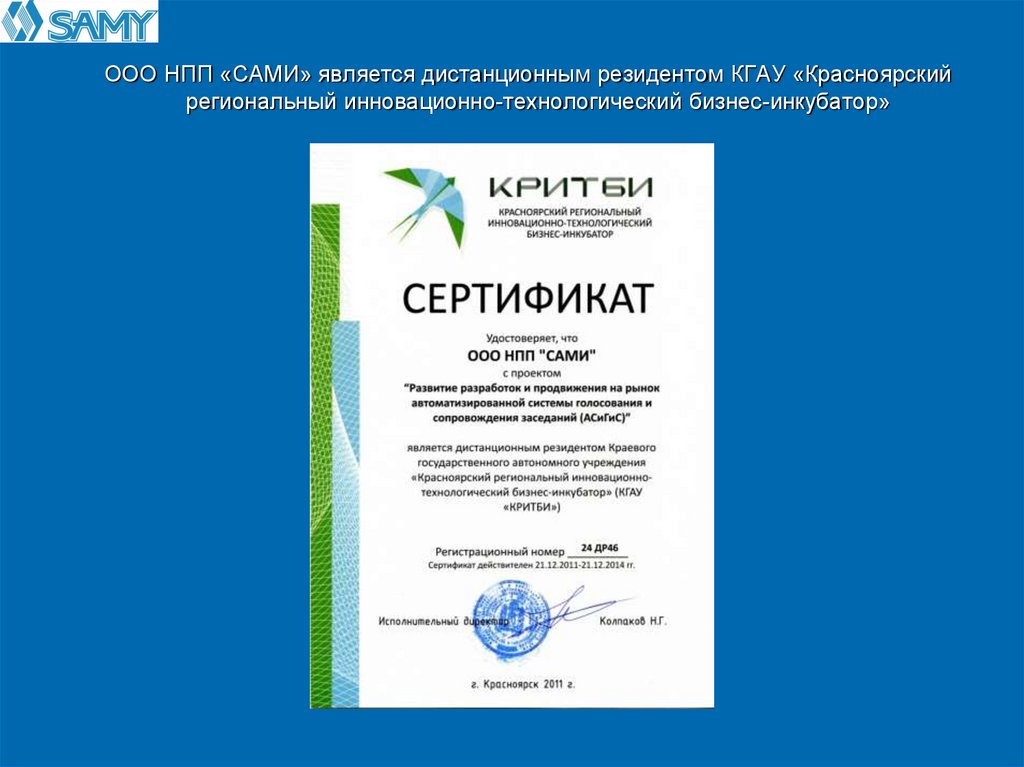 ООО НПП «САМИ» является дистанционным резидентом КГАУ «Красноярскийрегиональный инновационно-технологический бизнес-инкубатор»
