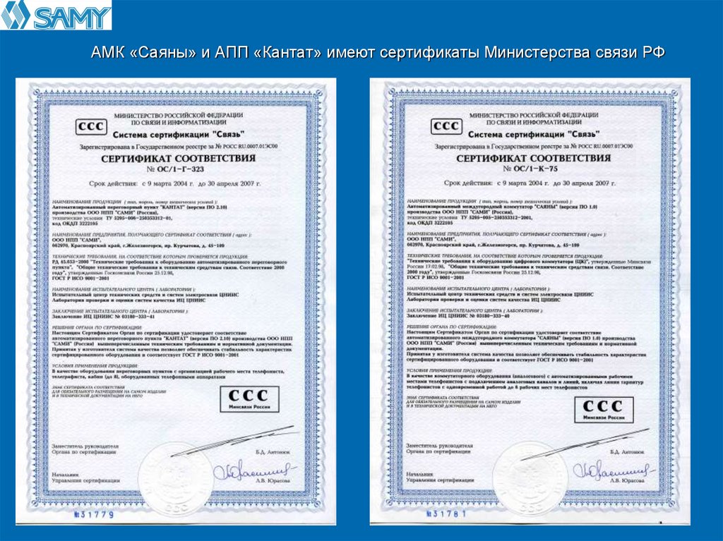 АМК «Саяны» и АПП «Кантат» имеют сертификаты Министерства связи РФ7.