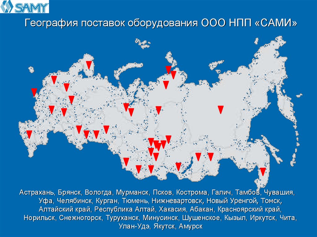 География поставок оборудования ООО НПП «САМИ»Астрахань, Брянск, Вологда, Мурманск, Псков, Кострома, Галич, Тамбов, Чувашия,