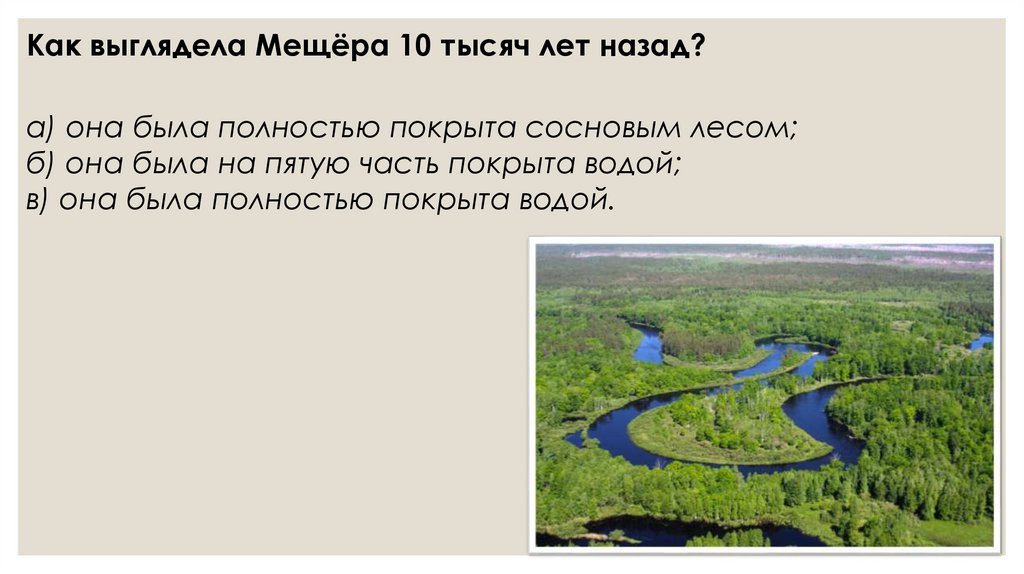 Как выглядела Мещёра 10 тысяч лет назад?а) она была полностью покрыта сосновым лесом;