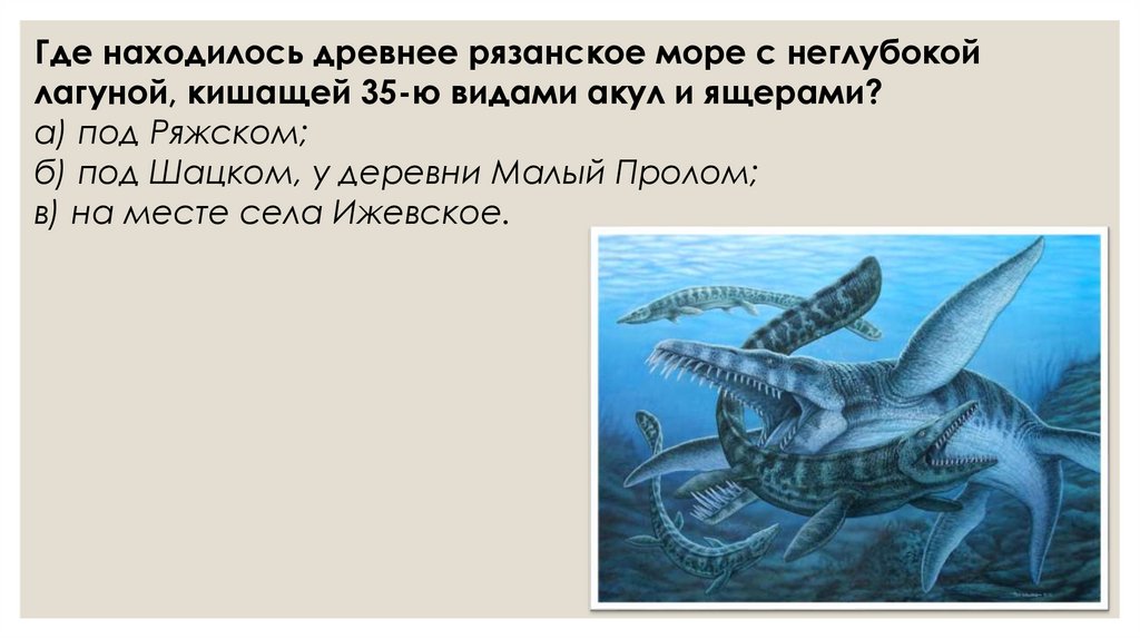 Где находилось древнее рязанское море с неглубокойлагуной, кишащей 35-ю видами акул и ящерами?