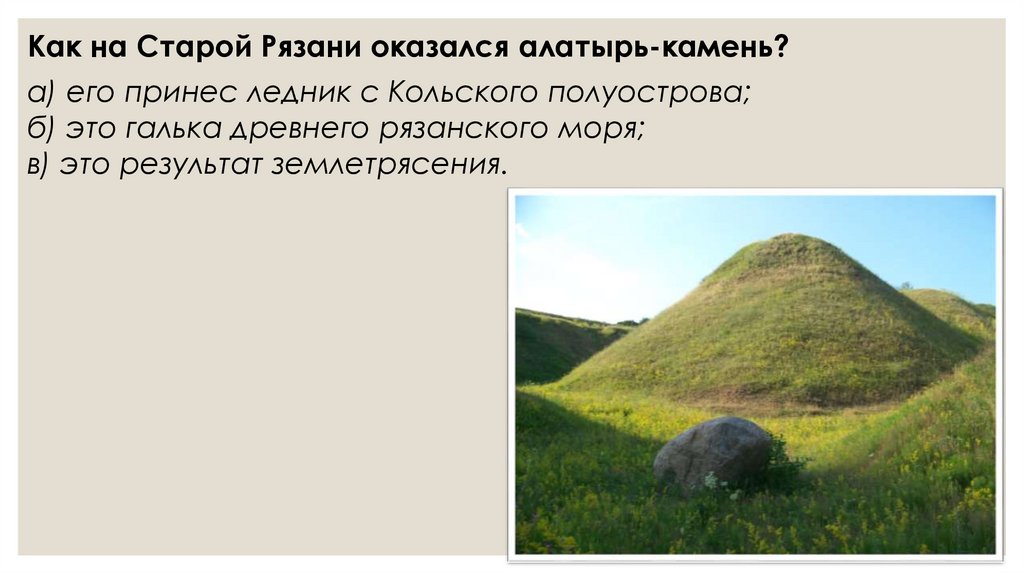 Как на Старой Рязани оказался алатырь-камень?а) его принес ледник с Кольского полуострова;