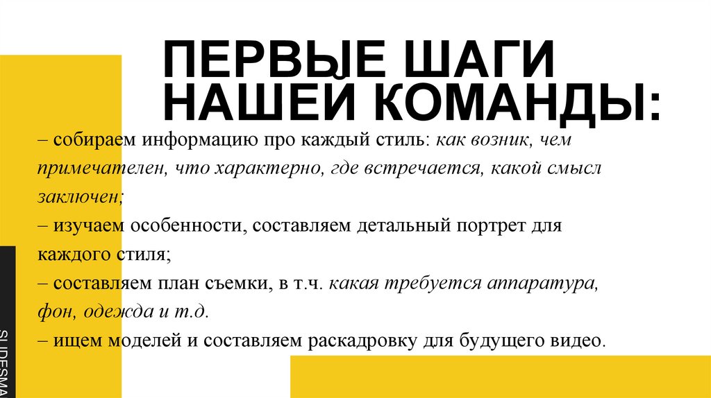 – собираем информацию про каждый стиль: как возник, чем