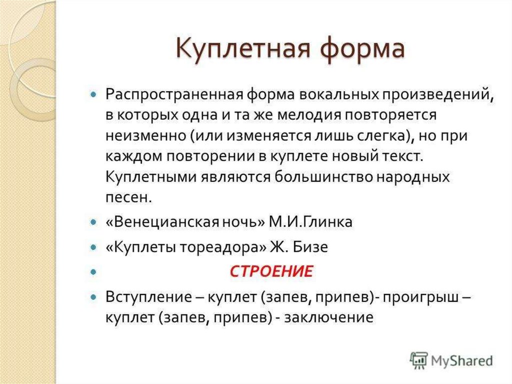 Куплетная форма(песни и хоровыепроизведения). Различные типы