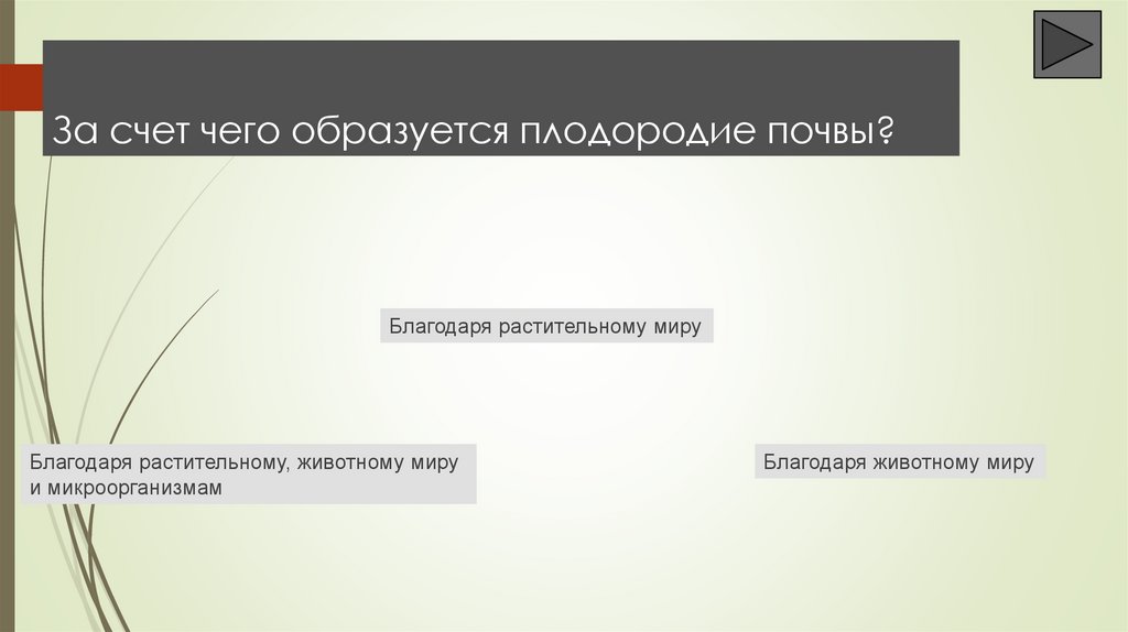 За счет чего образуется плодородие почвы?Благодаря растительному миру