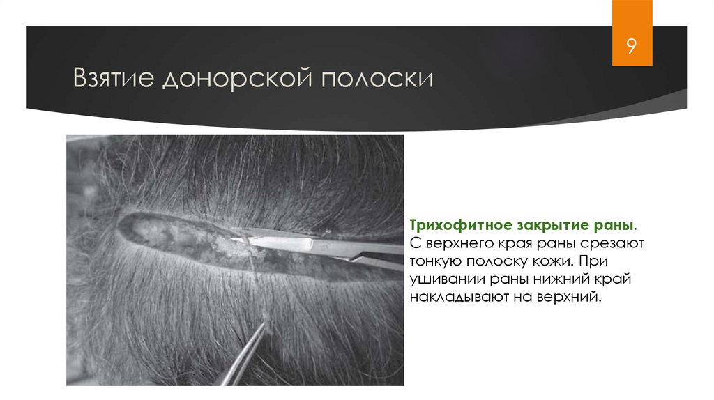 С верхнего края донорского дефекта срезают 1–2 мм, применяя трихофитное