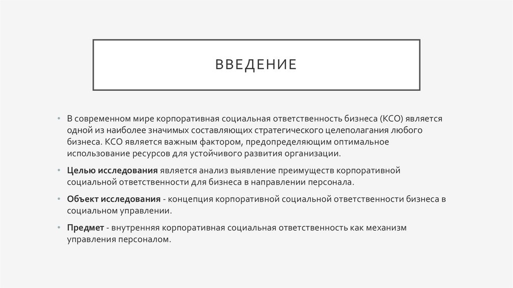 • Объект исследования - концепция корпоративной социальной ответственности бизнеса в