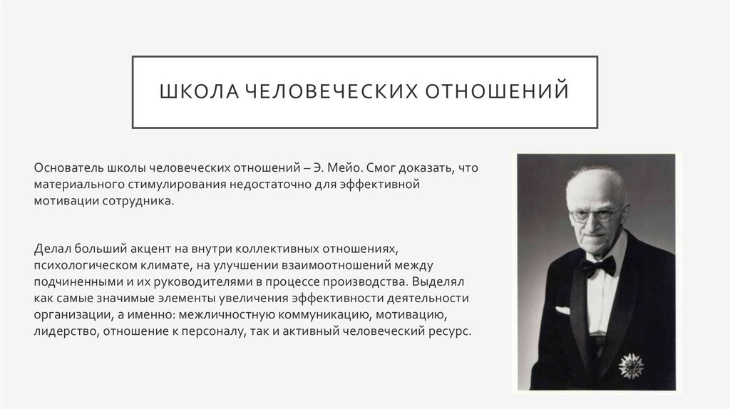 ШКОЛА ЧЕЛОВЕЧЕСКИХ ОТНОШЕНИЙОснователь школы человеческих отношений – Э. Мейо. Смог доказать, что