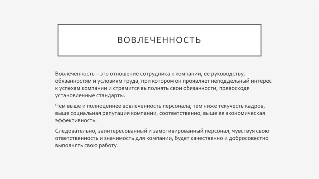 ВОВЛЕЧЕННОСТЬВовлеченность – это отношение сотрудника к компании, ее руководству,