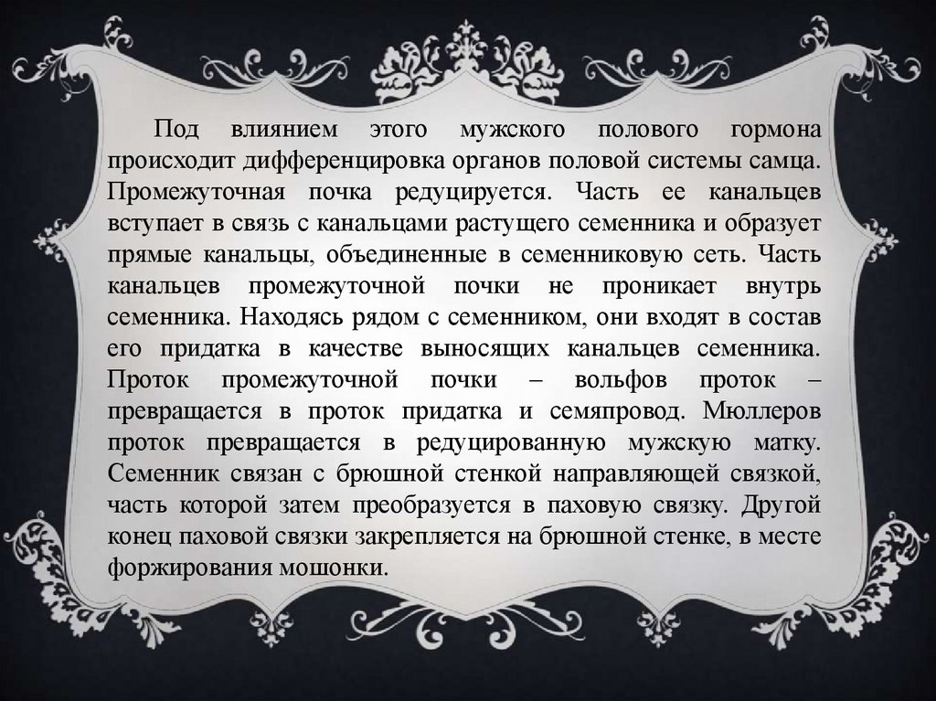 Под влиянием этого мужского полового гормонапроисходит дифференцировка органов половой системы самца.