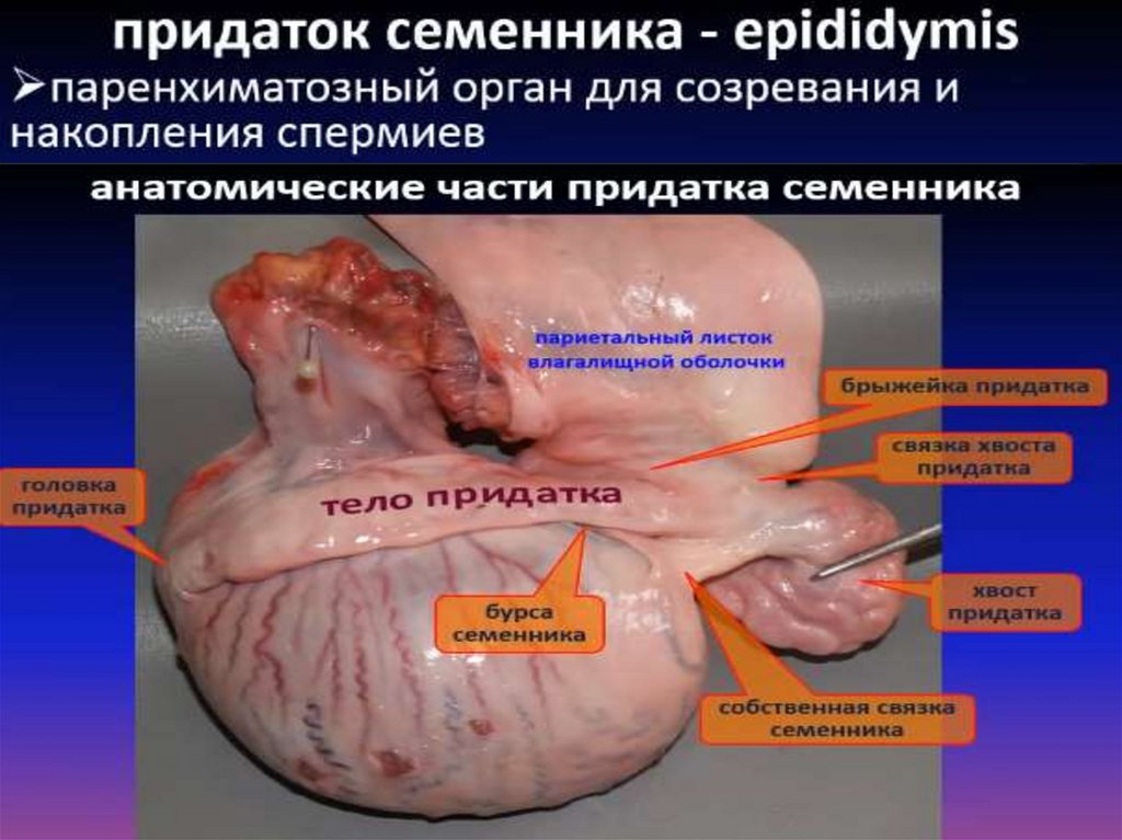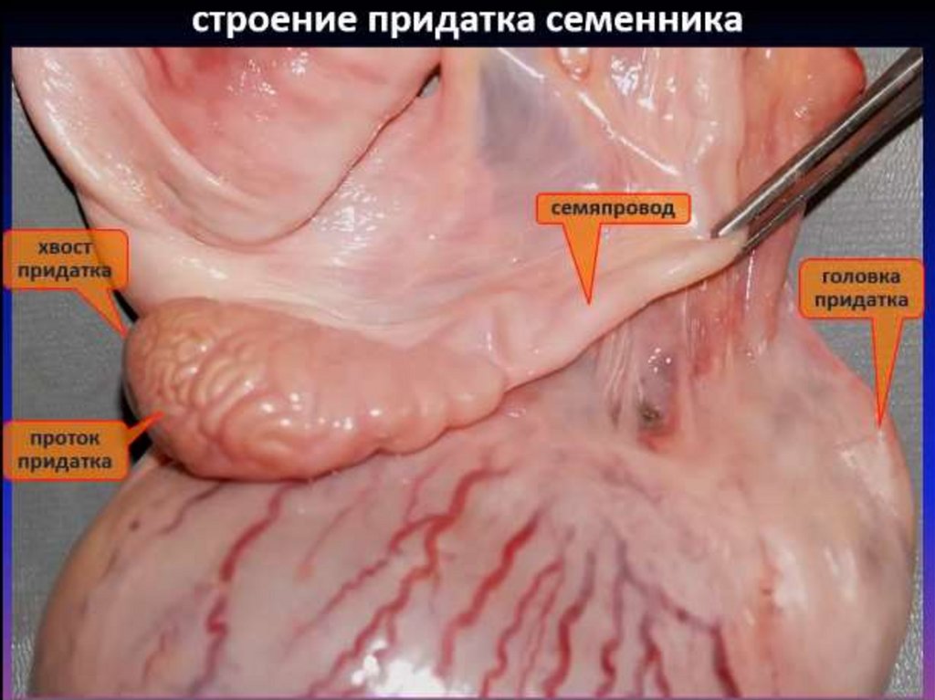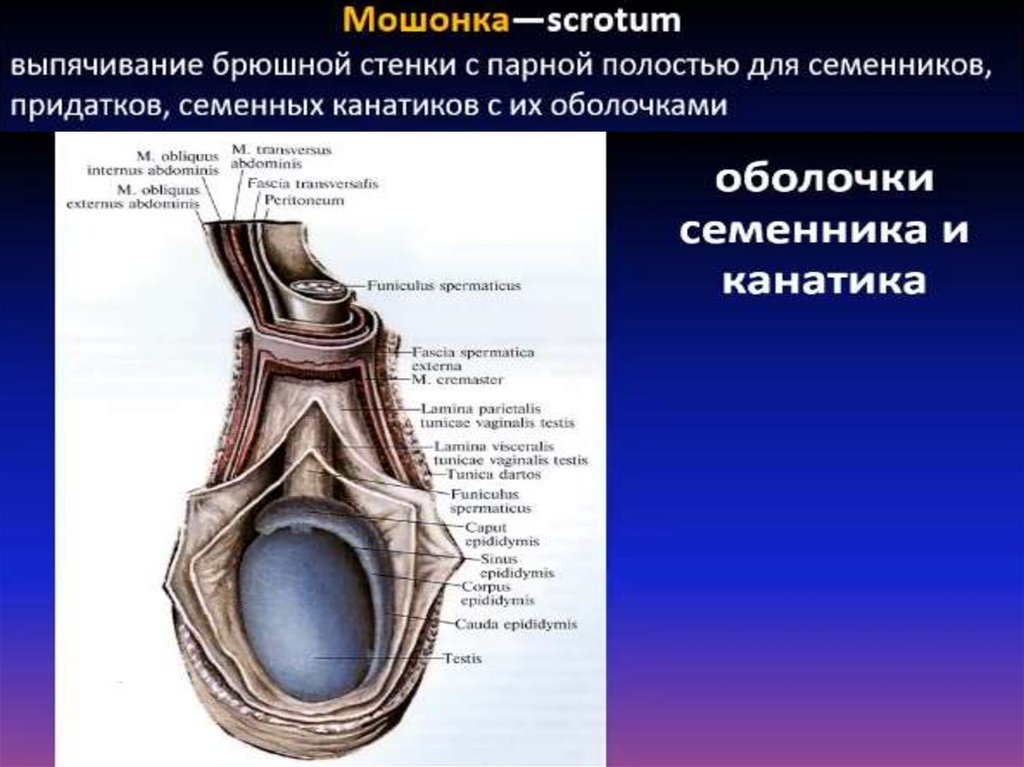 В результате роста плода и сокращения паховой связки семенниквместе с придатком перемещается в мошонку начиная с 4-месячного