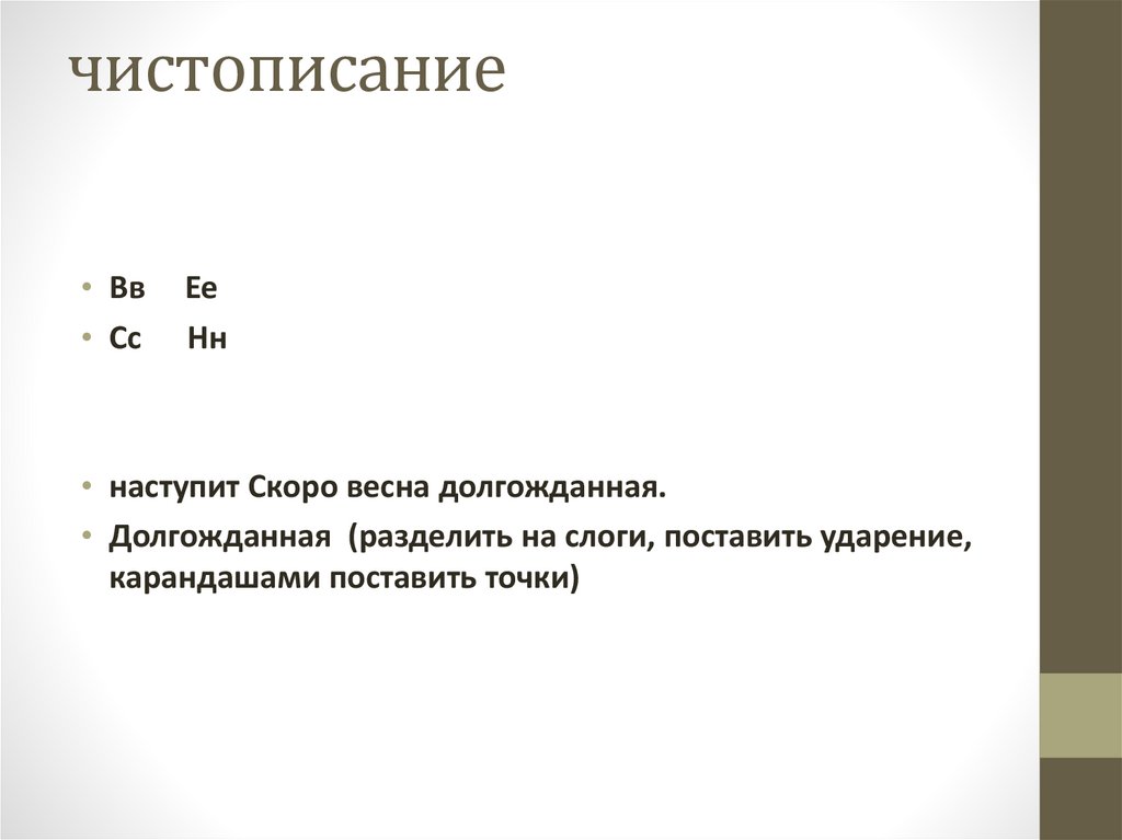 • Долгожданная (разделить на слоги, поставить ударение,
