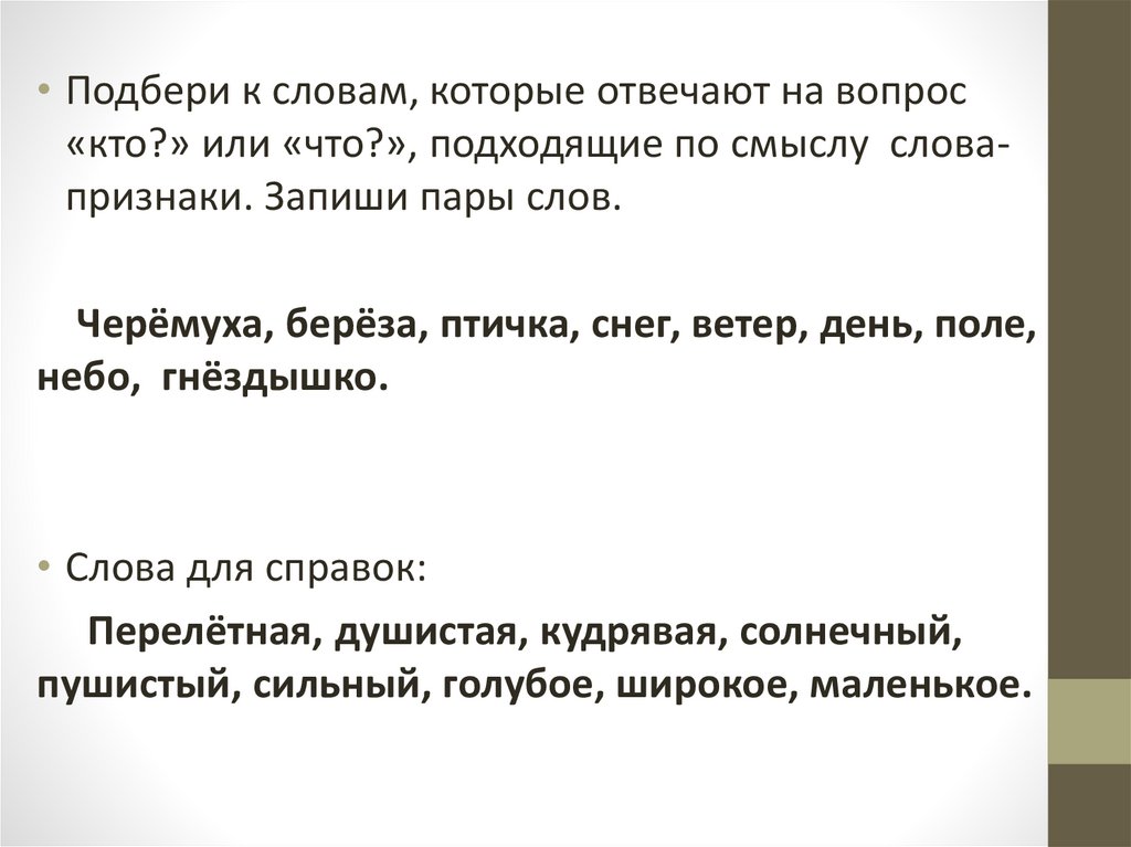 • Подбери к словам, которые отвечают на вопрос«кто?» или «что?», подходящие по смыслу словапризнаки. Запиши пары слов.