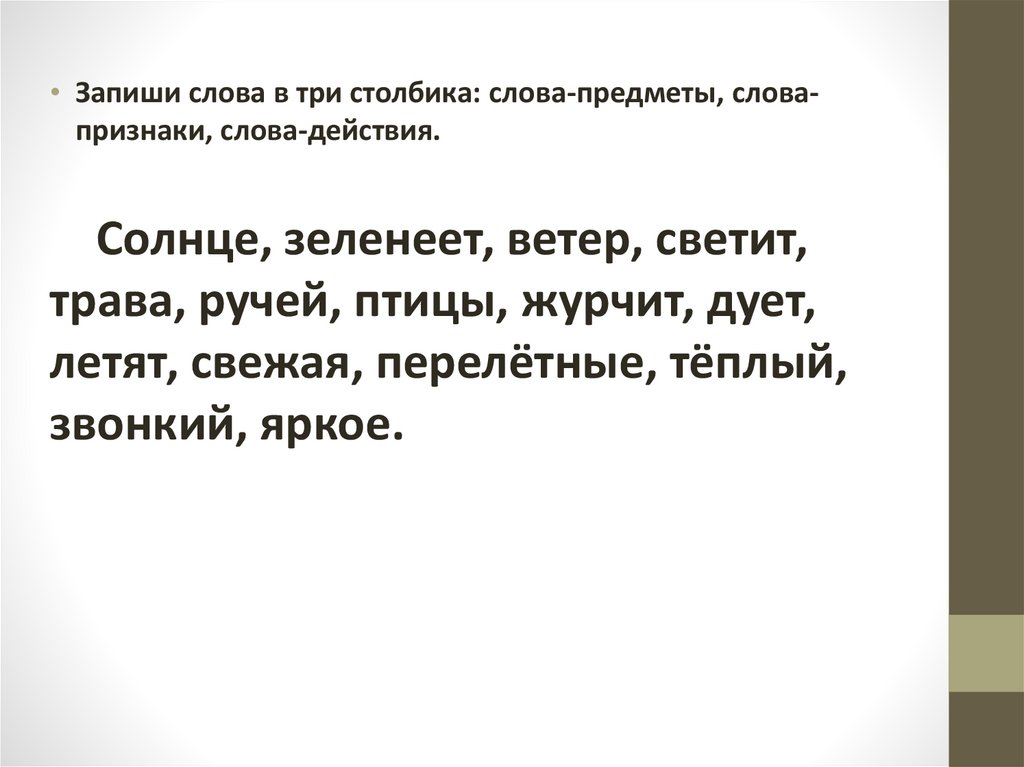 • Запиши слова в три столбика: слова-предметы, словапризнаки, слова-действия.Солнце, зеленеет, ветер, светит,