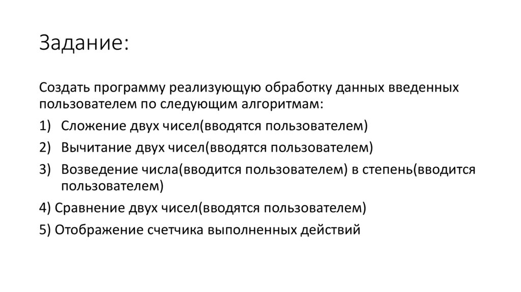 3) Возведение числа(вводится пользователем) в степень(вводится