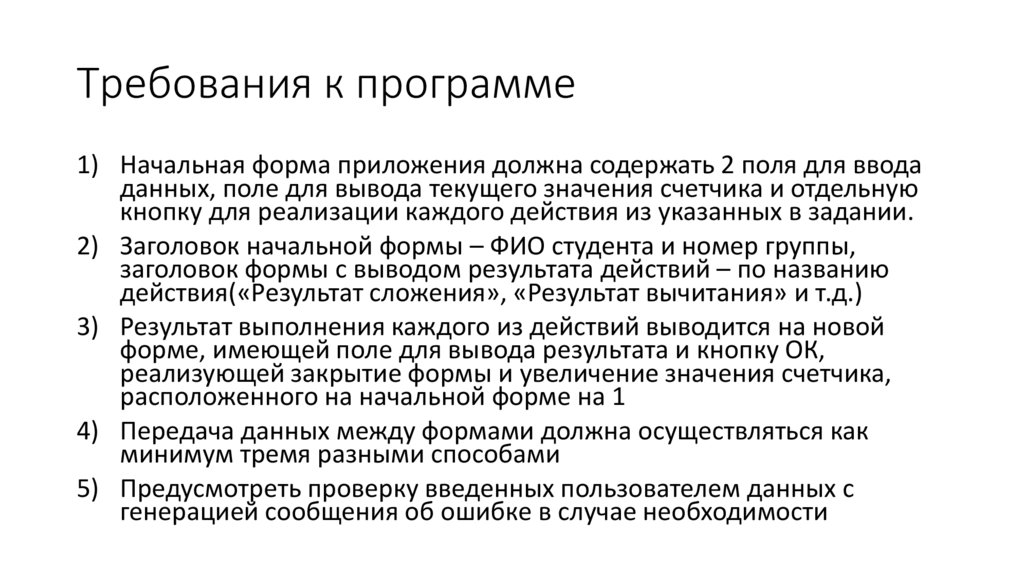 Требования к программе1) Начальная форма приложения должна содержать 2 поля для ввода