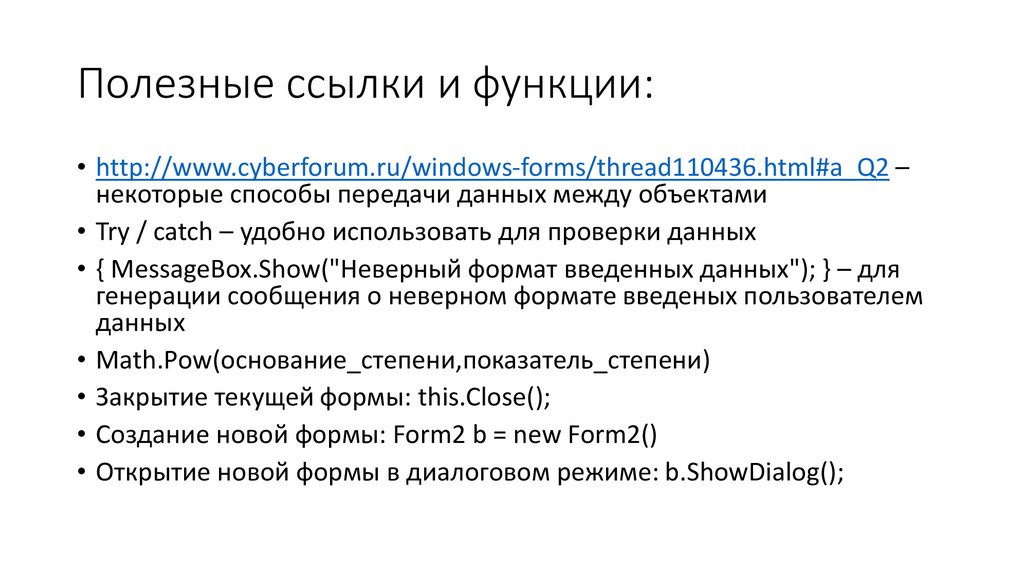 • Открытие новой формы в диалоговом режиме: b.ShowDialog();