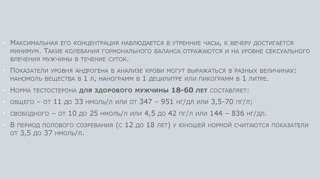 • МАКСИМАЛЬНАЯ ЕГО КОНЦЕНТРАЦИЯ НАБЛЮДАЕТСЯ В УТРЕННИЕ ЧАСЫ, К ВЕЧЕРУ ДОСТИГАЕТСЯМИНИМУМ. ТАКИЕ КОЛЕБАНИЯ ГОРМОНАЛЬНОГО БАЛАНСА ОТРАЖАЮТСЯ И НА УРОВНЕ СЕКСУАЛЬНОГО