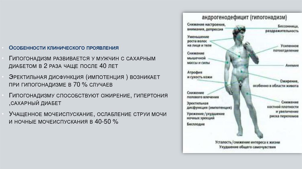 • ОСОБЕННОСТИ КЛИНИЧЕСКОГО ПРОЯВЛЕНИЯ• ГИПОГОНАДИЗМ РАЗВИВАЕТСЯ У МУЖЧИН С САХАРНЫМ