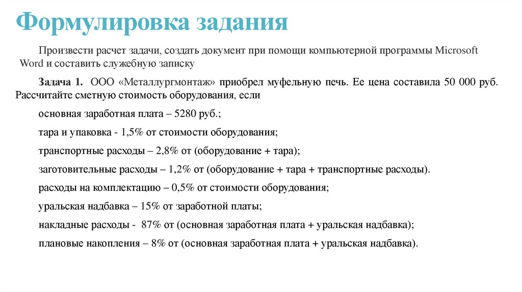 Формулировка заданияПроизвести расчет задачи, создать документ при помощи компьютерной программы Microsoft