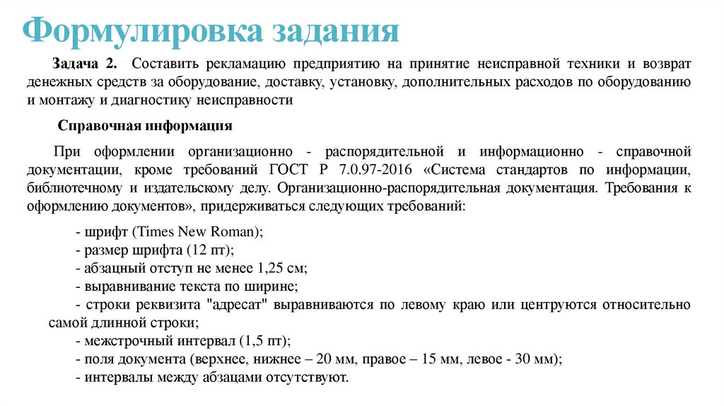 Формулировка заданияЗадача 2. Составить рекламацию предприятию на принятие неисправной техники и возврат