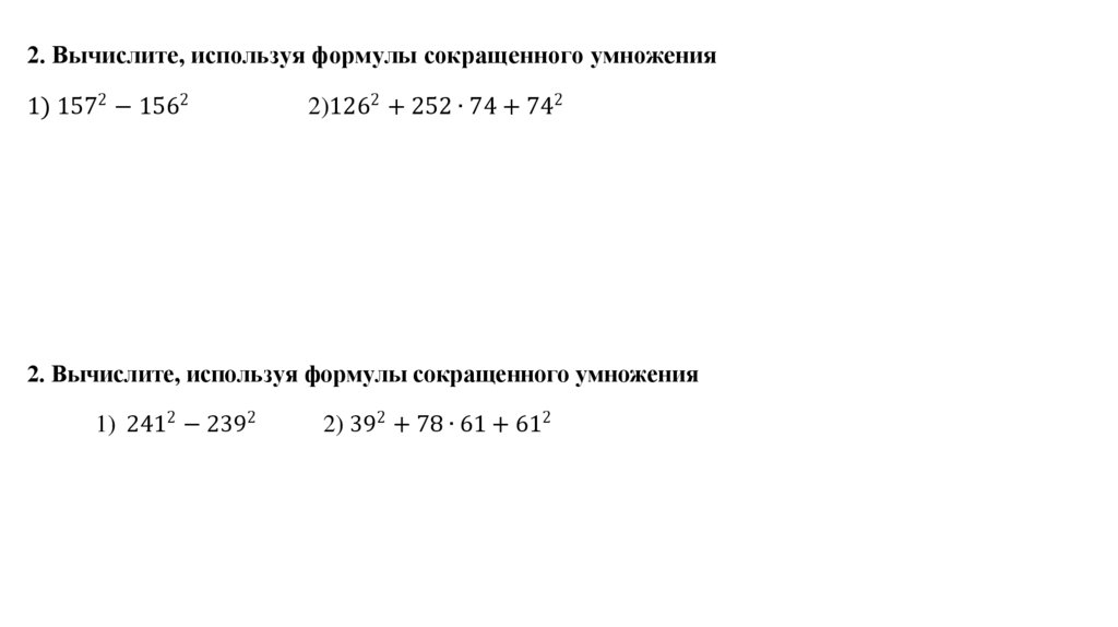 2. Вычислите, используя формулы сокращенного умножения1) 1572 − 1562