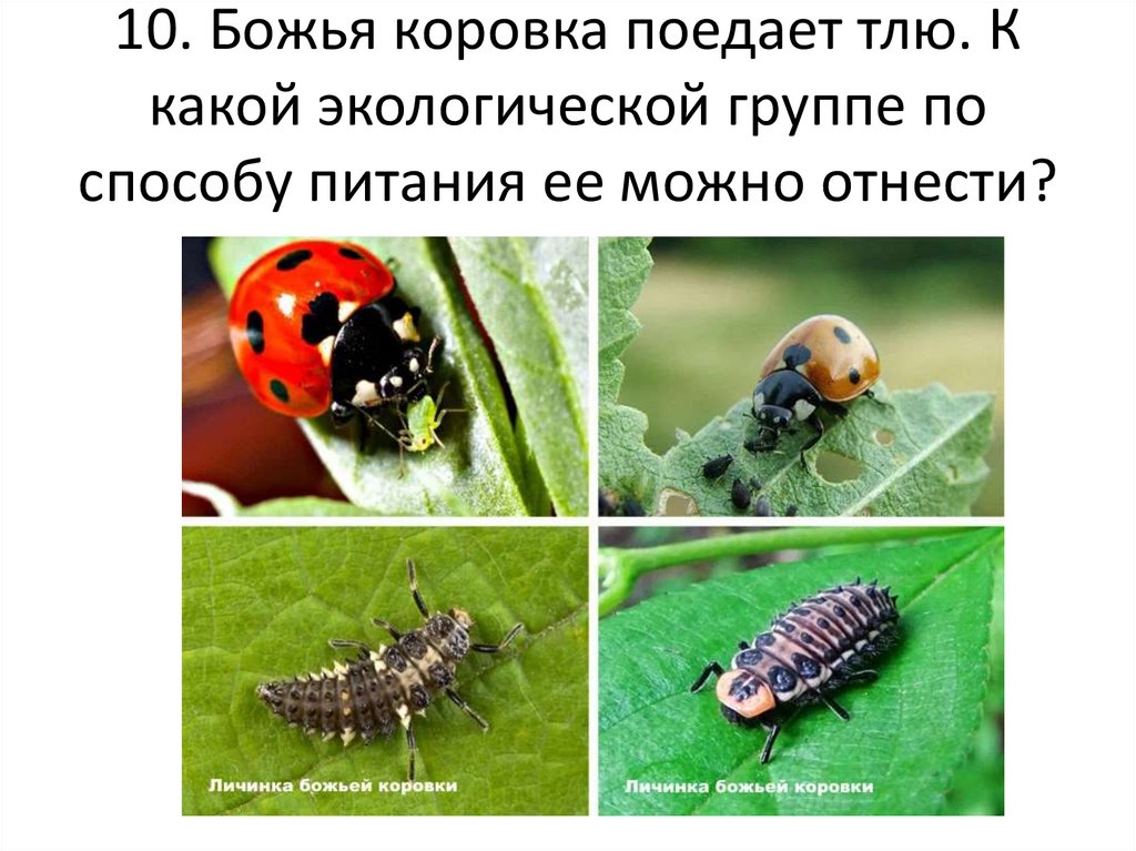 10. Божья коровка поедает тлю. Ккакой экологической группе по