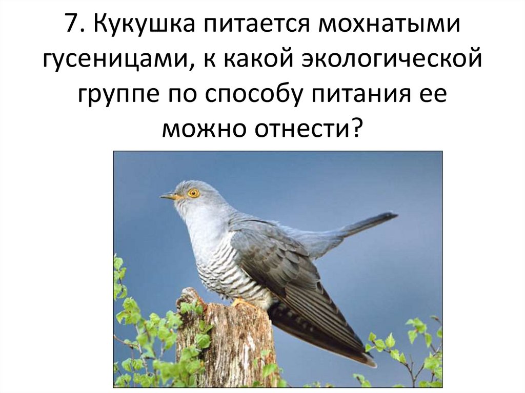 7. Кукушка питается мохнатымигусеницами, к какой экологической