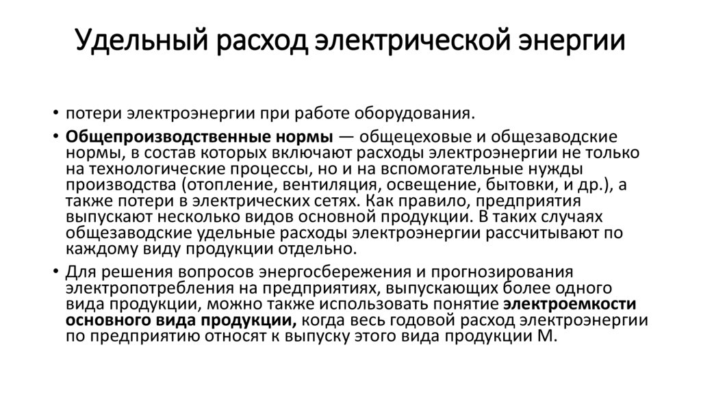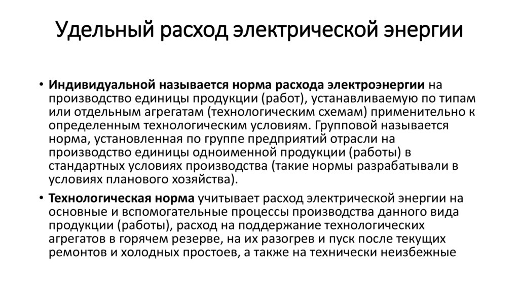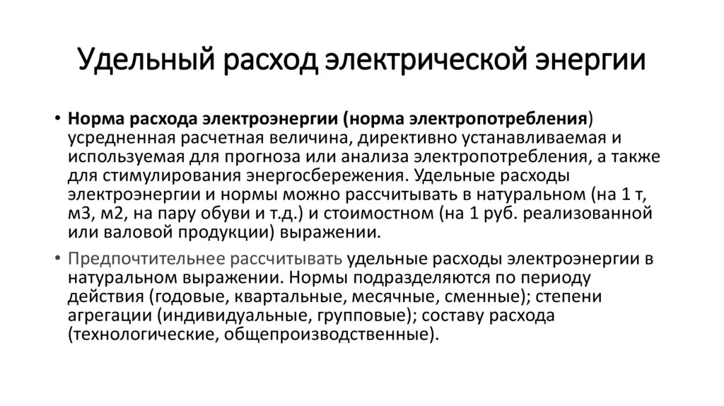 Удельный расход электрической энергии• Норма расхода электроэнергии (норма электропотребления)