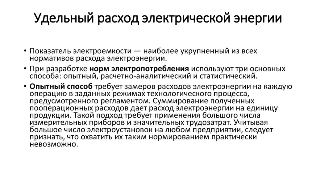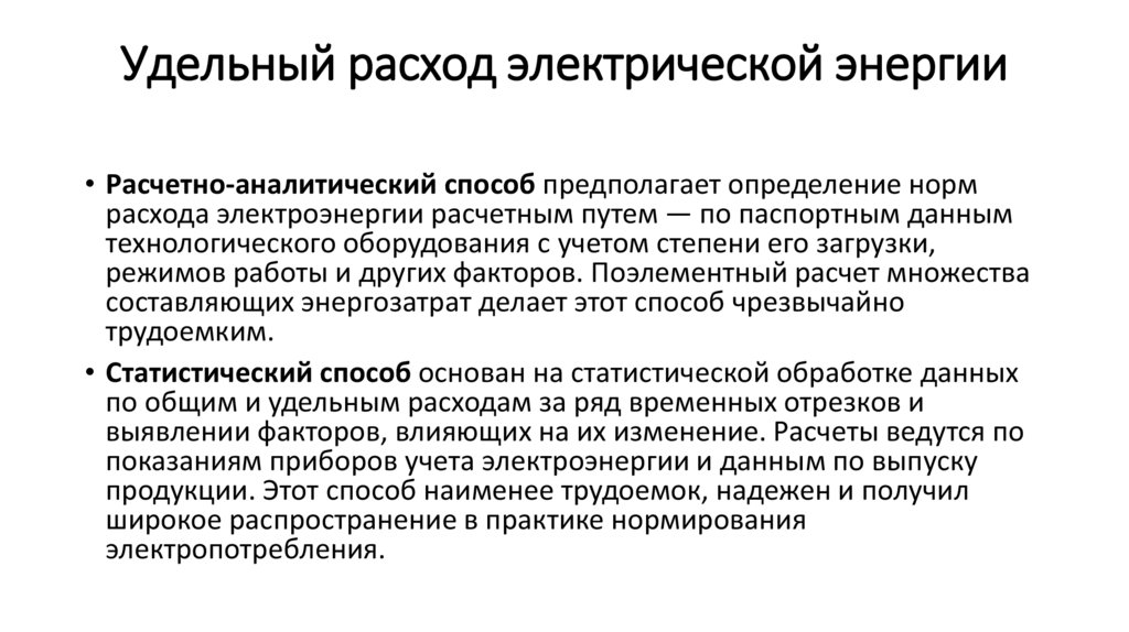 Удельный расход электрической энергии• Расчетно-аналитический способ предполагает определение норм