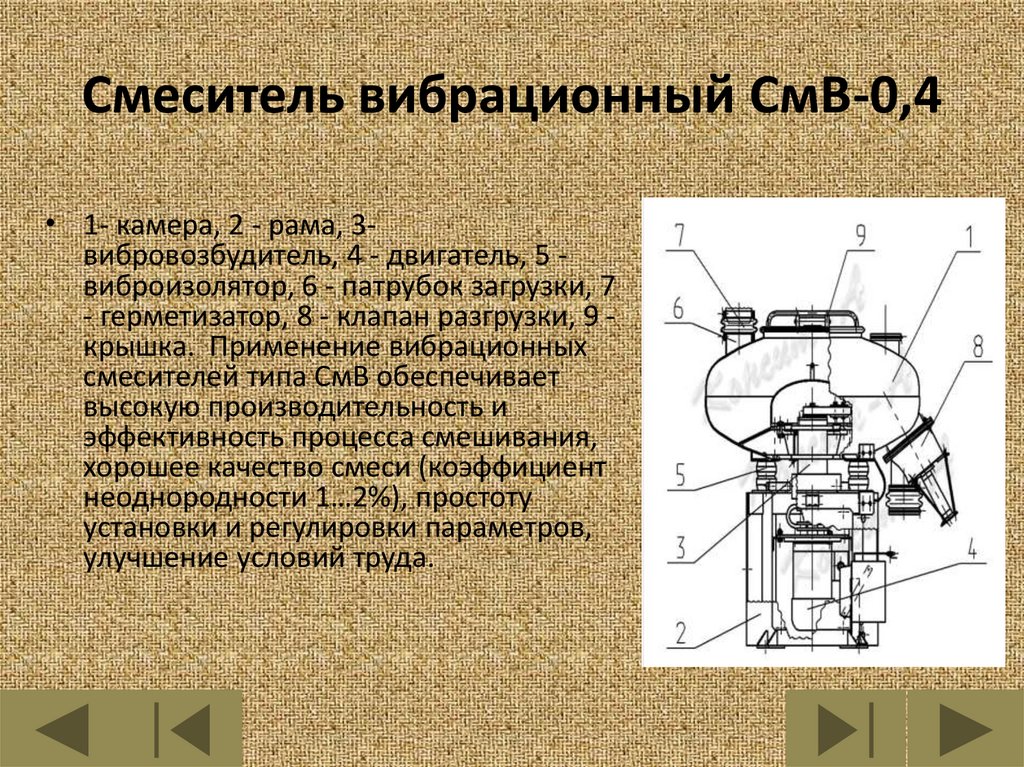 Смеситель вибрационный СмВ-0,4• 1- камера, 2 - рама, 3вибровозбудитель, 4 - двигатель, 5 виброизолятор, 6 - патрубок загрузки, 7