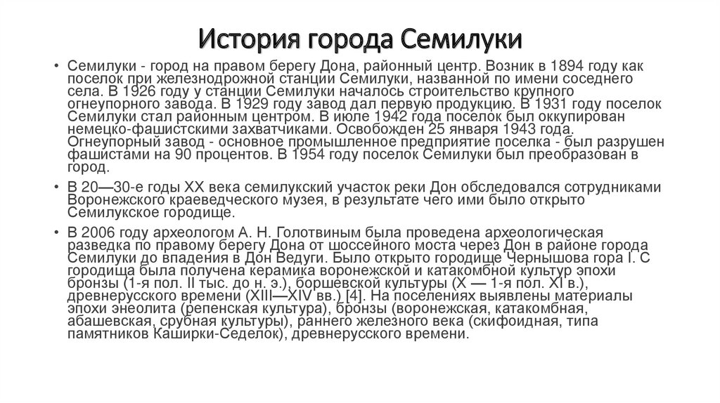 История города Семилуки• Семилуки - город на правом берегу Дона, районный центр. Возник в 1894 году как