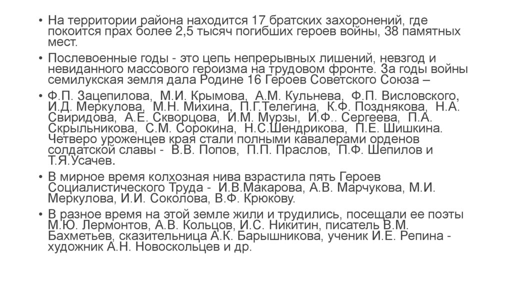 • На территории района находится 17 братских захоронений, гдепокоится прах более 2,5 тысяч погибших героев войны, 38 памятных