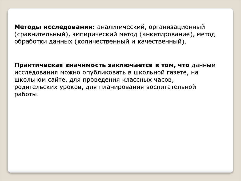 Методы исследования: аналитический, организационный(сравнительный), эмпирический метод (анкетирование), метод