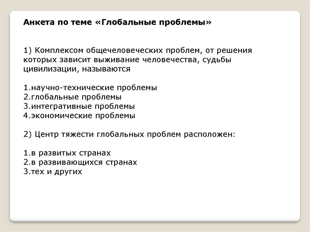 Анкета по теме «Глобальные проблемы»1) Комплексом общечеловеческих проблем, от решения