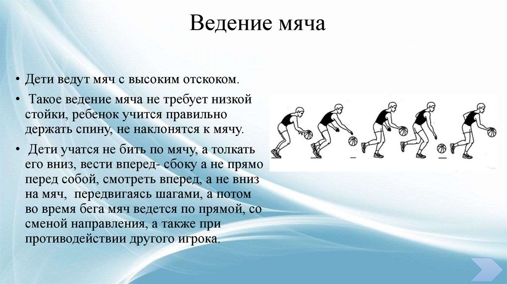 Ведение мяча• Дети ведут мяч с высоким отскоком.