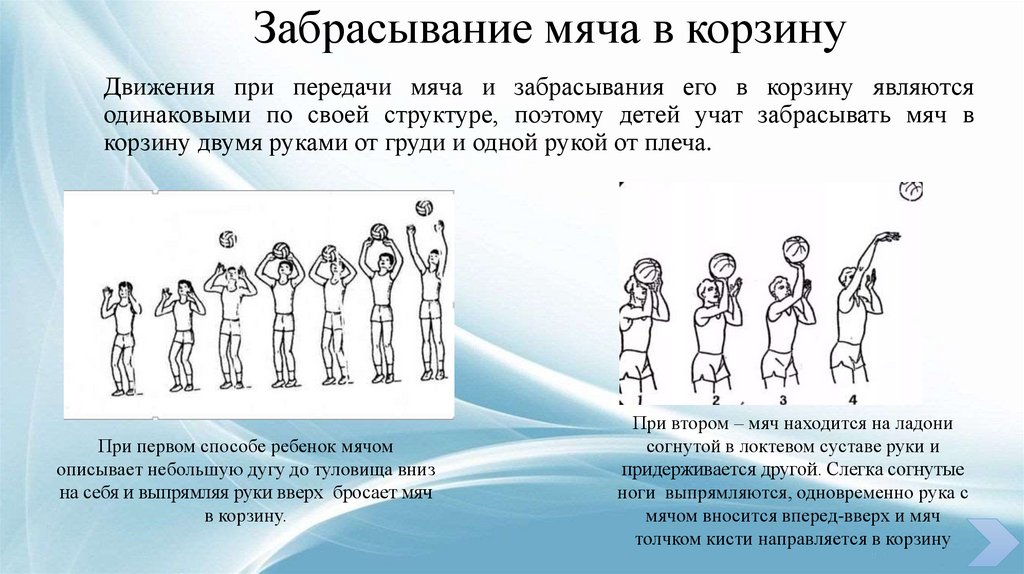 Забрасывание мяча в корзинуДвижения при передачи мяча и забрасывания его в корзину являются