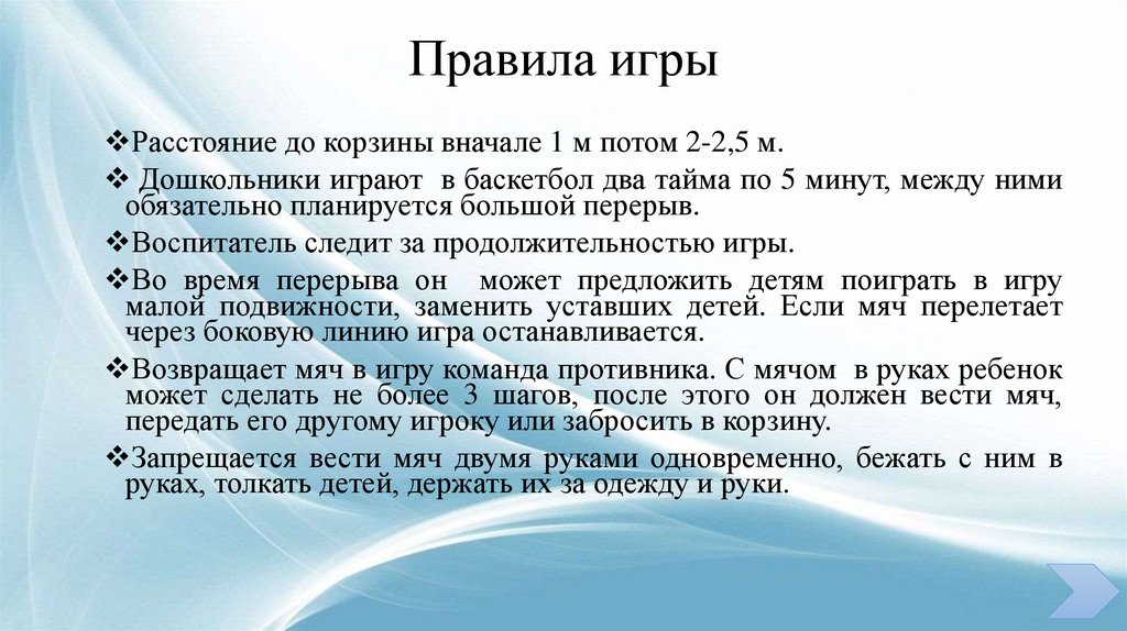 Правила игрыРасстояние до корзины вначале 1 м потом 2-2,5 м.