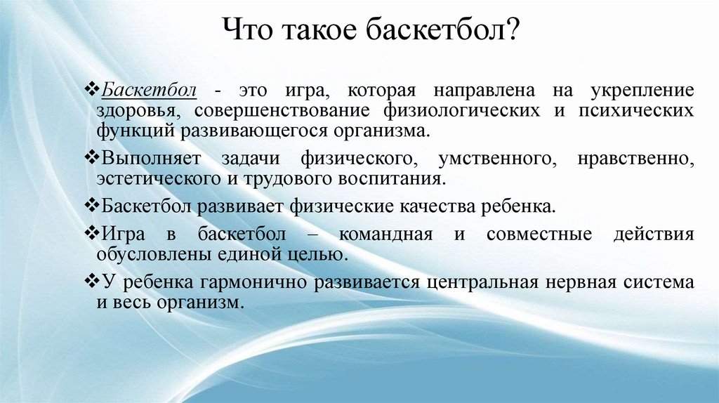 Что такое баскетбол?Баскетбол - это игра, которая направлена на укрепление