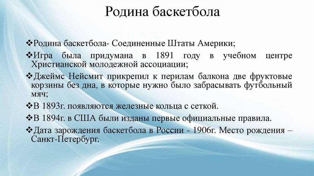 Дата зарождения баскетбола в России - 1906г. Место рождения –