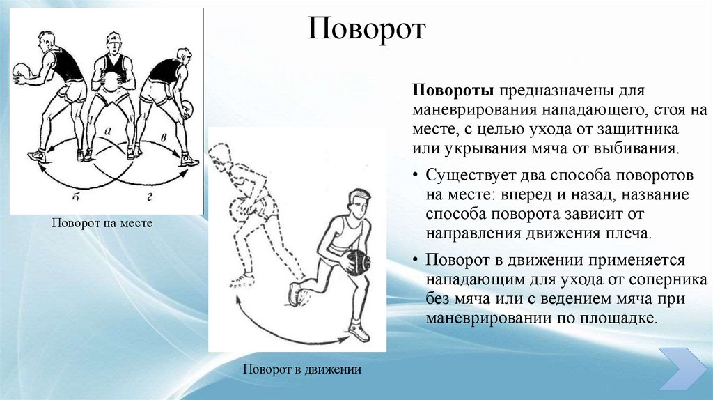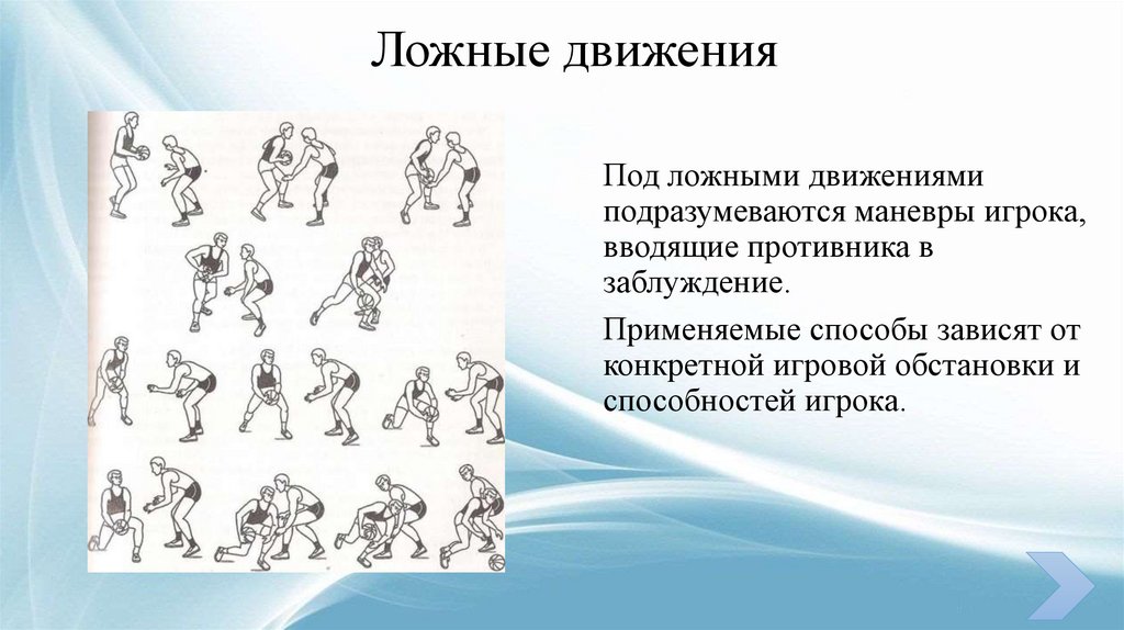 повороты, прыжки, ложные движения.