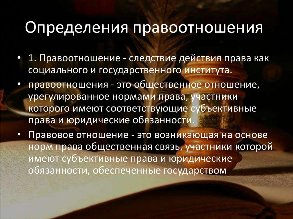 Определения правоотношения:• 1. Правоотношение - следствие действия права как