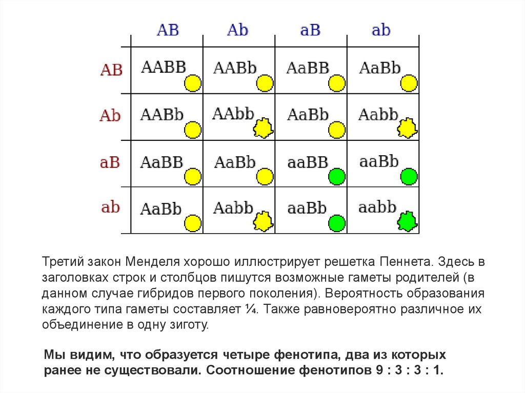 Третий закон Менделя хорошо иллюстрирует решетка Пеннета. Здесь взаголовках строк и столбцов пишутся возможные гаметы родителей (в